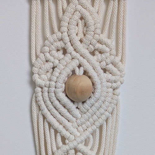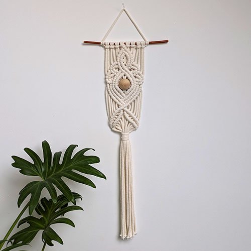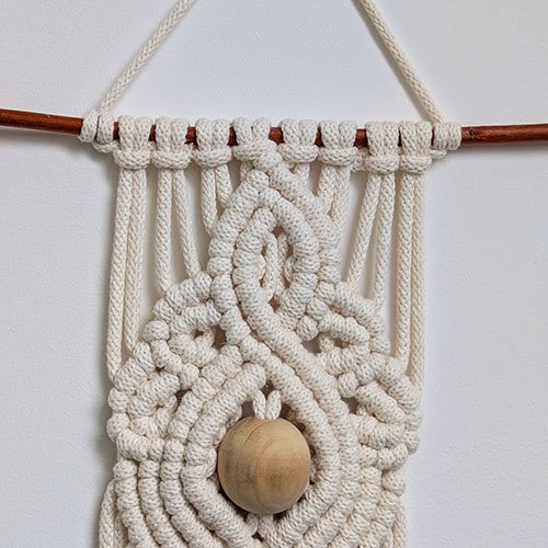 Elle est constituée d’un support en bois d’osier récupéré après taille et est ornée d’une perle en bois