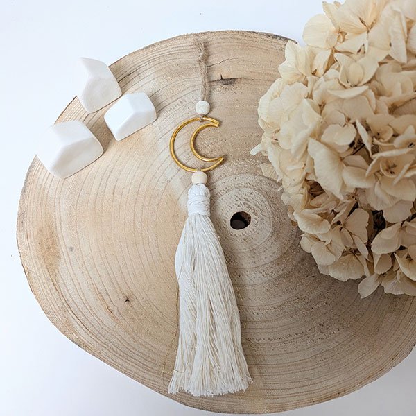 Composée d’une lune métallique dorée, de perles en bois et de coton peigné écru parsemé de fils dorés
